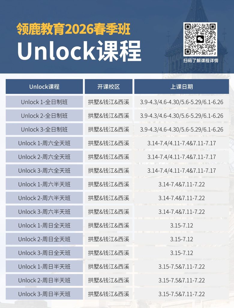 深知家长们想让孩子吃透Unlock教材的需求,杭州领鹿教育全新打造Unlock春季班,专为不同基础、不同年龄段孩子定制,完美匹配教材学习节奏: